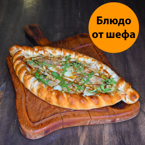 Это блюдо представляет собой лепешку-пиццу, выполненную в итальянском стиле. C ломтиками ароматного бекона, сыр моцарелла, свежие яйца, сливочный соус Альфредо и соус песто. Все вместе создает гармоничное сочетание вкусов и текстур, которое порадует любителей сытных блюд с ярким вкусом.